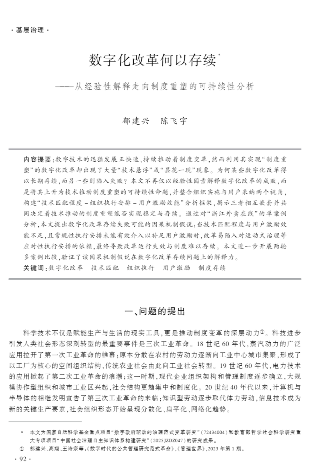近日,浙江工商大学党委书记、重要窗口研究院院长郁建兴教授作为第一作者撰写的论文《数字化改革何以存续——从经验性解释走向制度重塑的可持续性分析》在《政治学研究》2025年第6期发表。《政治学研究》是全国唯一的国内外公开发行的政治学专业学术理论刊物,中国社会科学院主管,中国社会科学院政治学研究所主办。